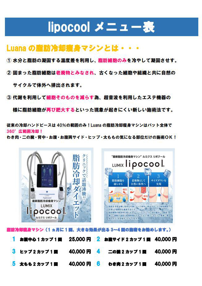 Luanaの脂肪冷却痩身は、脂肪細胞だけを冷却し、代謝によって自然排出を促す最新施術。